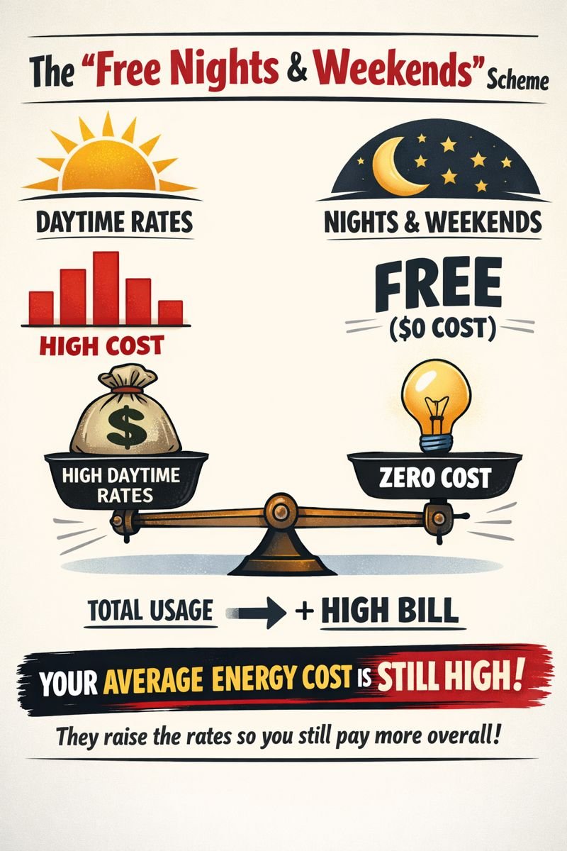 One of their common schemes is “free nights and weekends”. What they do is simply to raise their rate far higher during the daytime, so the net amount you pay is still high. Your “cost” during nights and weekends is zero, but if you take your total usage and divide it into what you’re really paying you’ll see that your energy charge is still high.